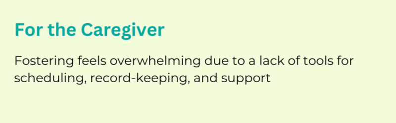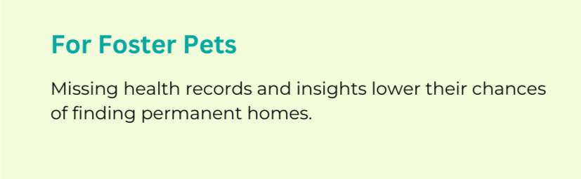 Foster caregivers feel overwhelmed due to a lack of tools for scheduling, record-keeping, and support. And as a result, foster pets, who have missing health records and insights, lower their chances of finding permanent homes.